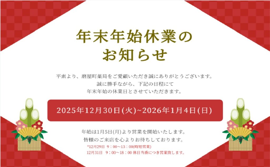 当薬局は12/29が今年のいったん最後の営業日となります。